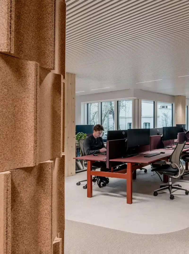 Each Parenthese tile is a creative building block. Whether arranged in criss-cross layouts or checkerboard sequences, it becomes a dynamic skin that shifts as light moves through the room. The natural surface absorbs sound while diffusing warmth and softness into the space.