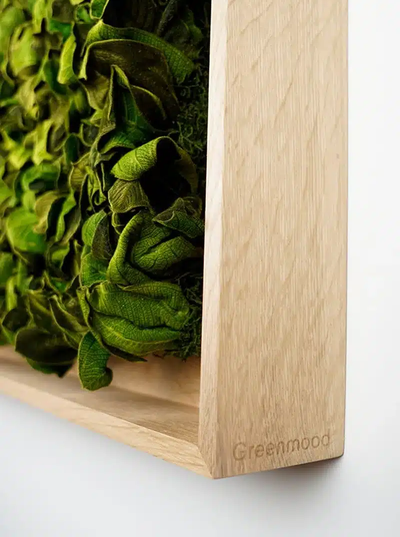 Framed is made with natural, preserved moss and foliage, stabilized through a non-toxic process that requires no water, light or maintenance. The oak frames are crafted in Europe using responsibly sourced wood and assembled with care.