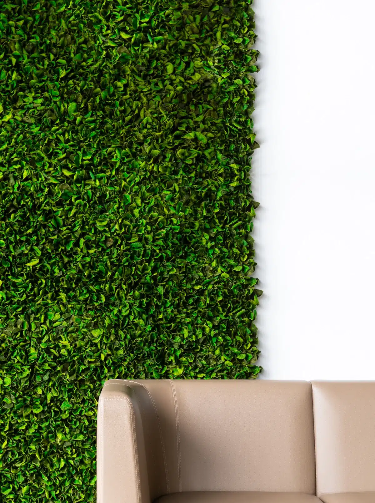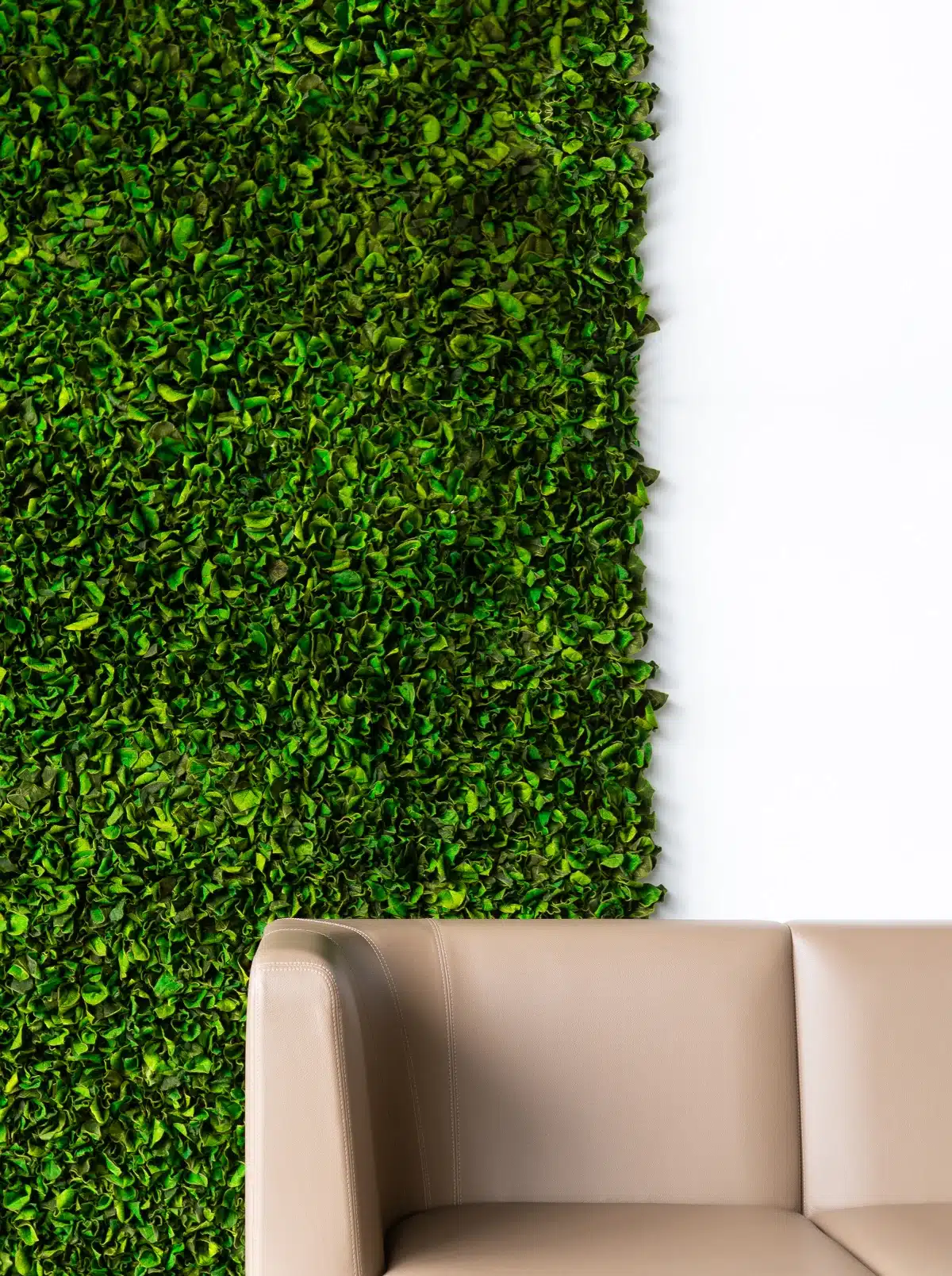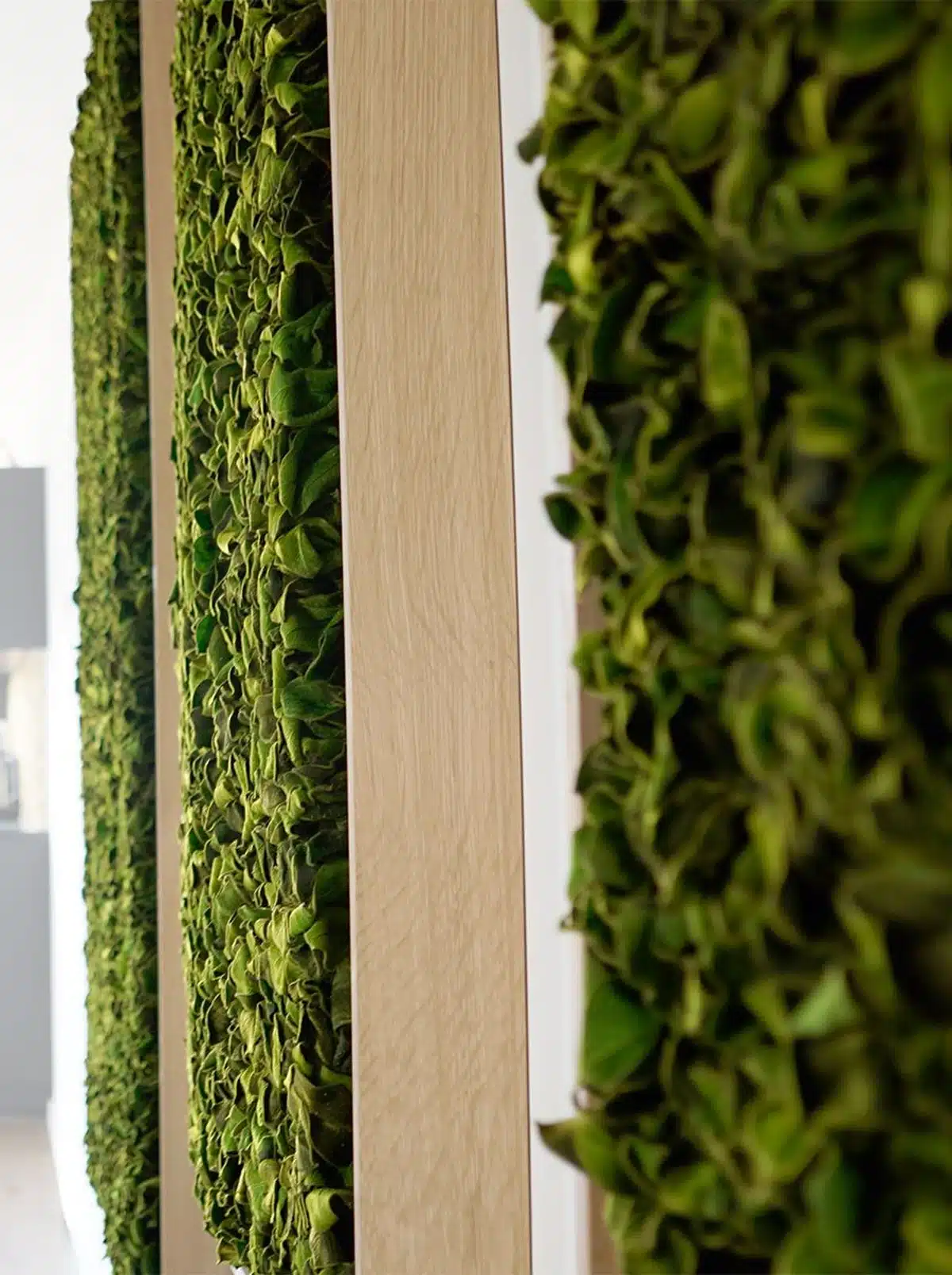 Each Velvet Leaf wall is a handmade composition, rich in texture and character. The foliage forms a layered, organic surface that reduces ambient noise while creating a calming atmosphere.