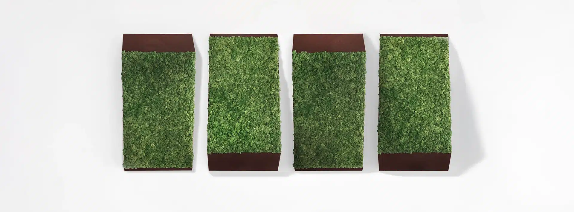 De mossbeklädda ytorna dämpar naturligt omgivningsljud och ger lugnande, biofila fördelar i både arbets- och fritidsmiljöer.