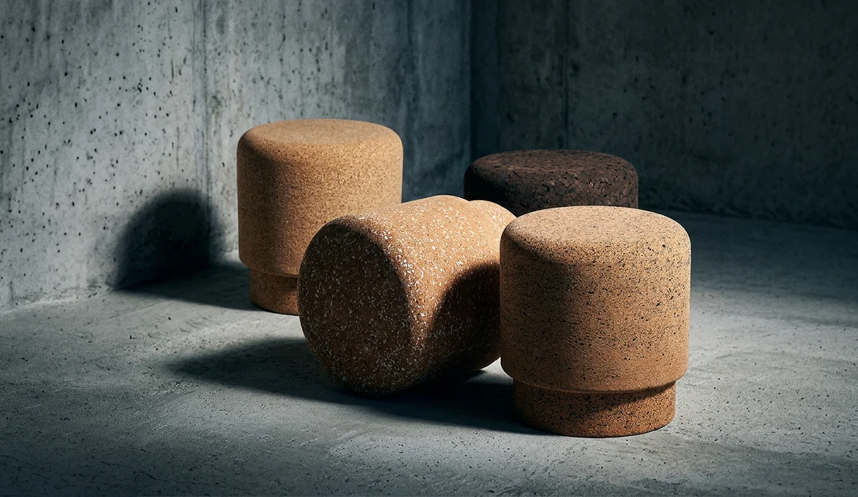 Sittmöbler i akustisk kork. Fyra versioner - från ren expanderad kork till återvunnen sneaker-mikrofiber. 100% återvunnen.